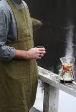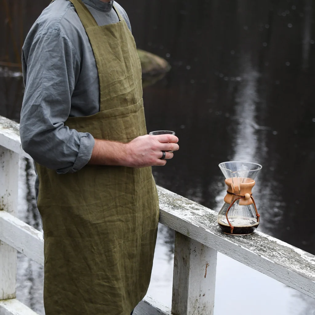 Linen apron in olive green or cinnamon colour. No button or bow fastening. Suitable for cooking but also as a casual garment. Adults ONE SIZE.